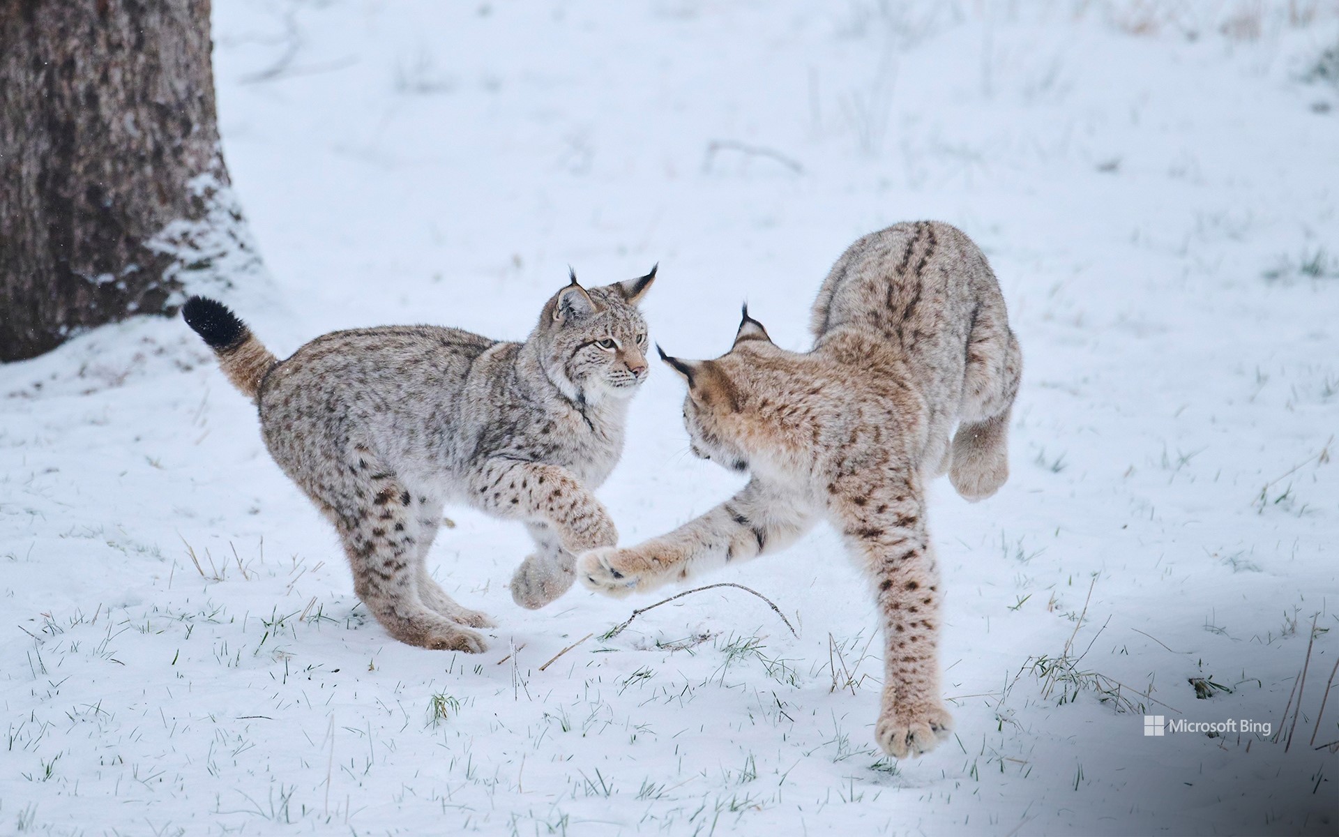 snow white winter felidae felinae cat lynxes bobcat terrestrial animal freezing carnivores fur wildlife snout ice frost precipitation playing in the snow tail whiskers